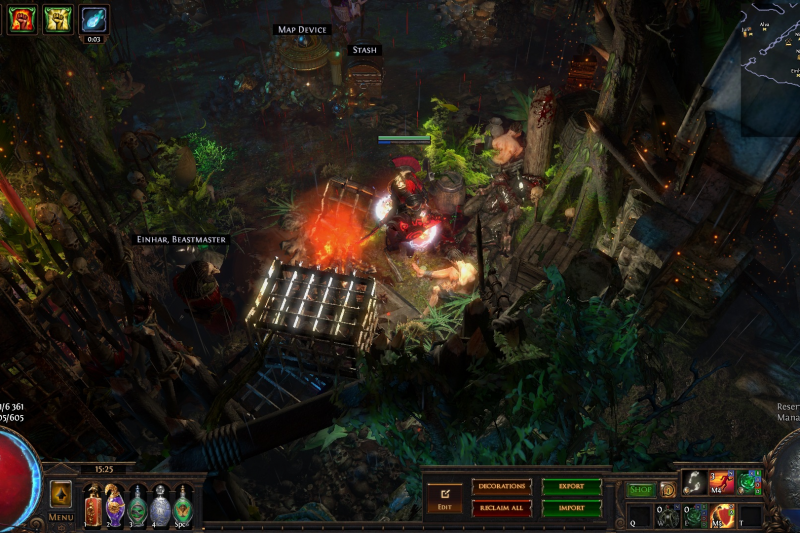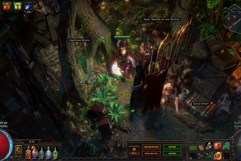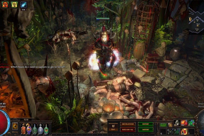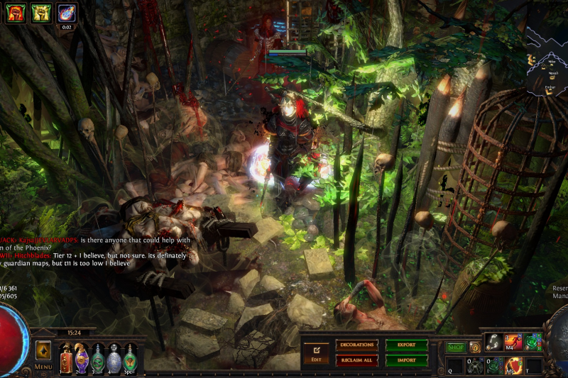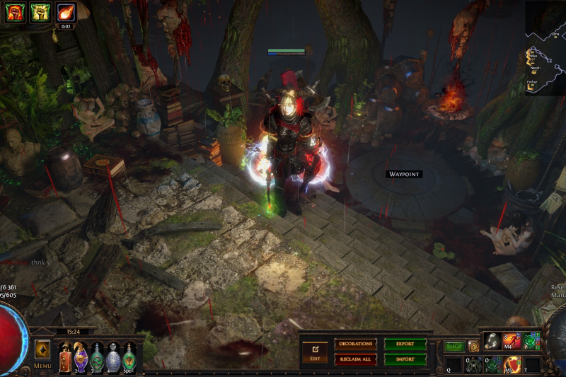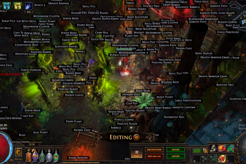 Welcome to the Desecrated Backwoods, residing deep within the dark forest. Many exiles have lost both their sanity and life here. The narrow paths around the small clearing are filled to the brim with bodies of failed adventurers and their petty loot. Their sanity seems to be draining quicker than anywhere else. The exiles that were driven to insanity have nowhere to hide, nowhere to run, and seem to fade into the woodland to become a part of nature again. How will it be exile? Are you sane enough, or will you become permanent decor of the Desecrated Backwoods? Welcome to my submission for the Path of Exile hideout competition. I made this hideout for my own usage and i wanted it to be usable whitout slowing my farming down so I've tried to place everything in reasonable places so i dont lose time mapping and such. Usability was key for me, while sticking to the theme. The only thing you need to pay for to get the look for the hideout is the blood rain and the hideout works whitout it aswell even though i prefer the dark moody atmosphere it gives. I hope some of you like it atleast. If anyone wants to check it out ingame you are welcome to whisper or add me on the character Ohlolololol
