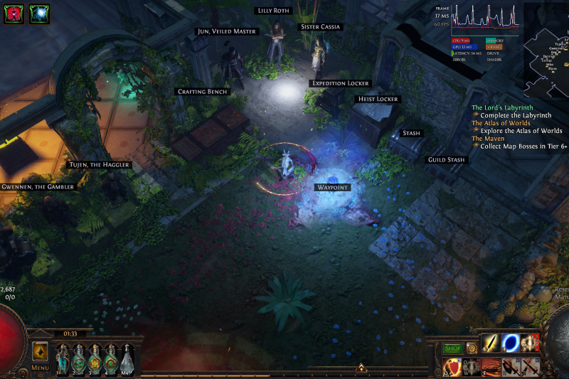 Luxurious hideout made to have the main area act as a courtyard in a forest, while still being utilitarian with everything needed for crafting/storage/maps in the same area and easily accessible.