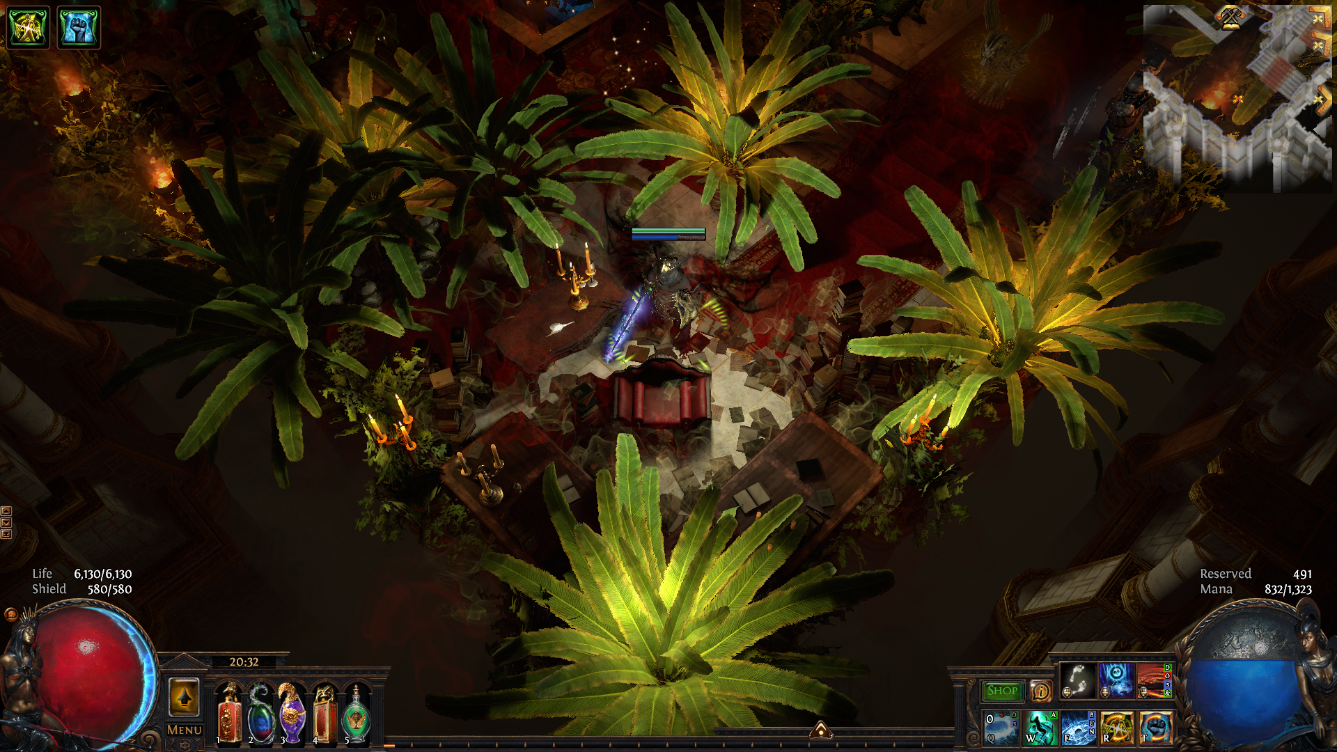 Cross between a messy researchers den with piles of books and reading nooks strewn  about the place crossed with a "corrupted" Hanging Gardens.