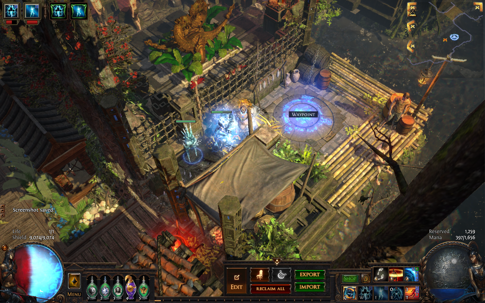 An elegant Primal fortress lies deep in the jungle on the banks of a long-unused waterway, reclaimed and repopulated by your exile and their allies.