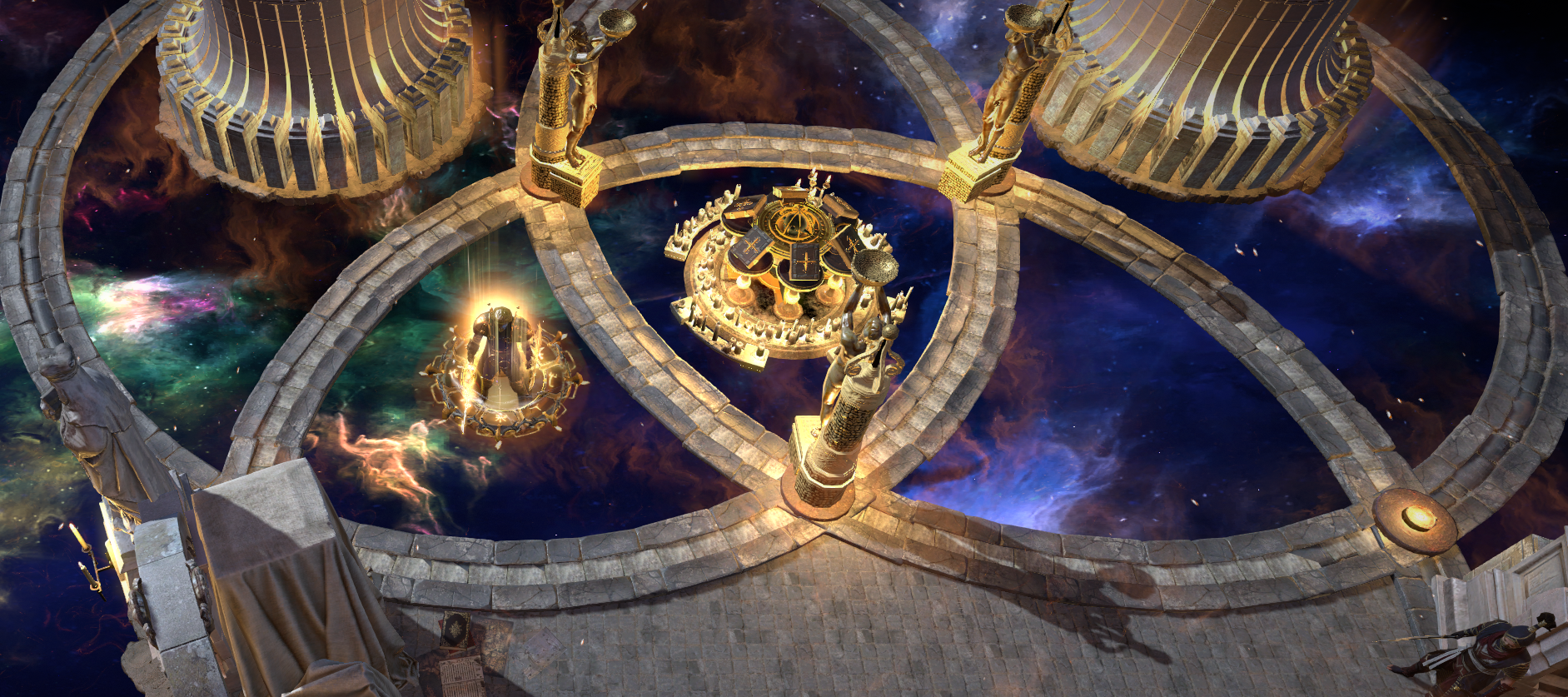 @UNTAG the buildings are made with Arched Gateway decorations, Sunspire Hideout effect for the beam and the floor underneath the buildings is done with Vaal Tablets decorations.