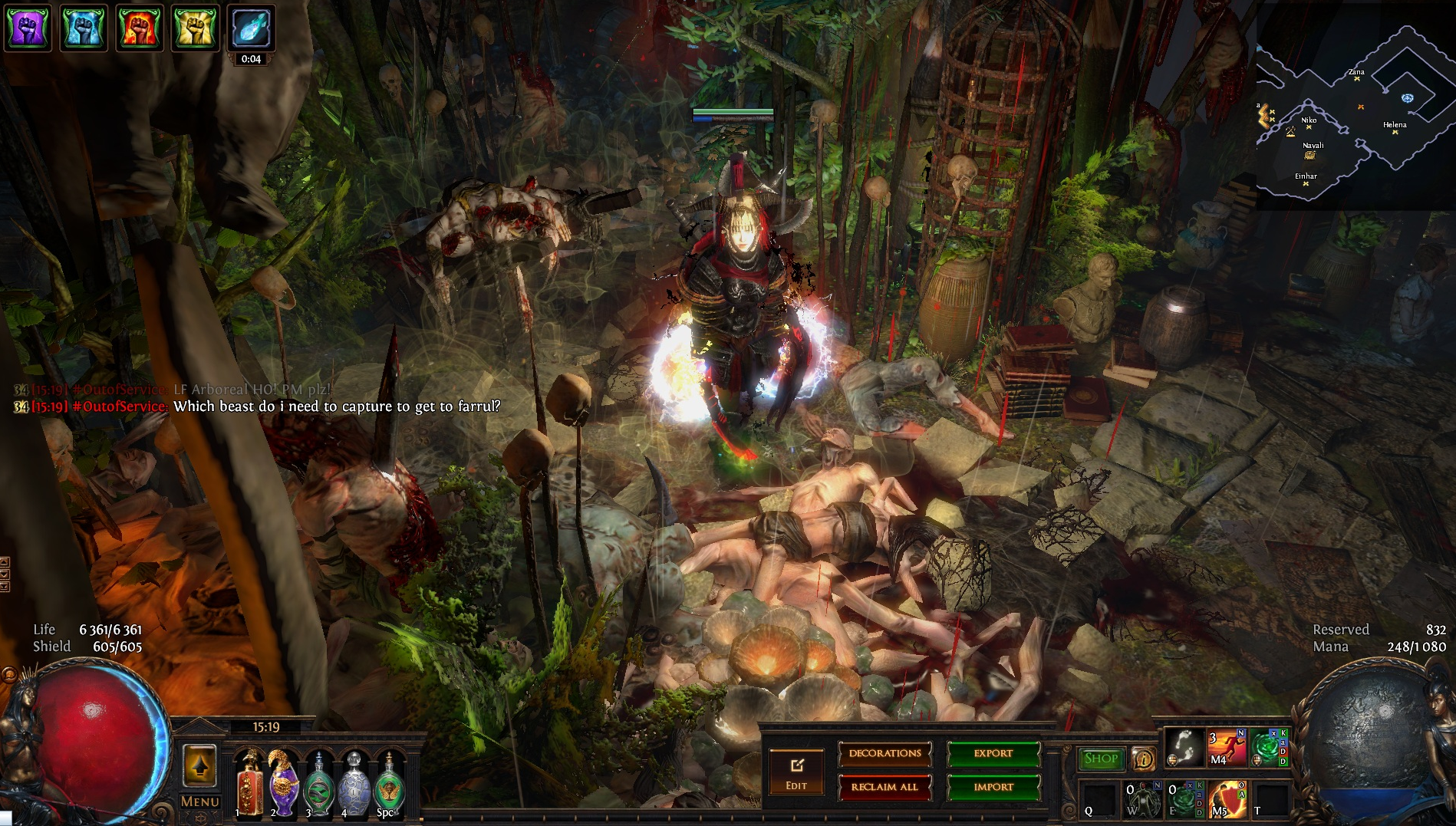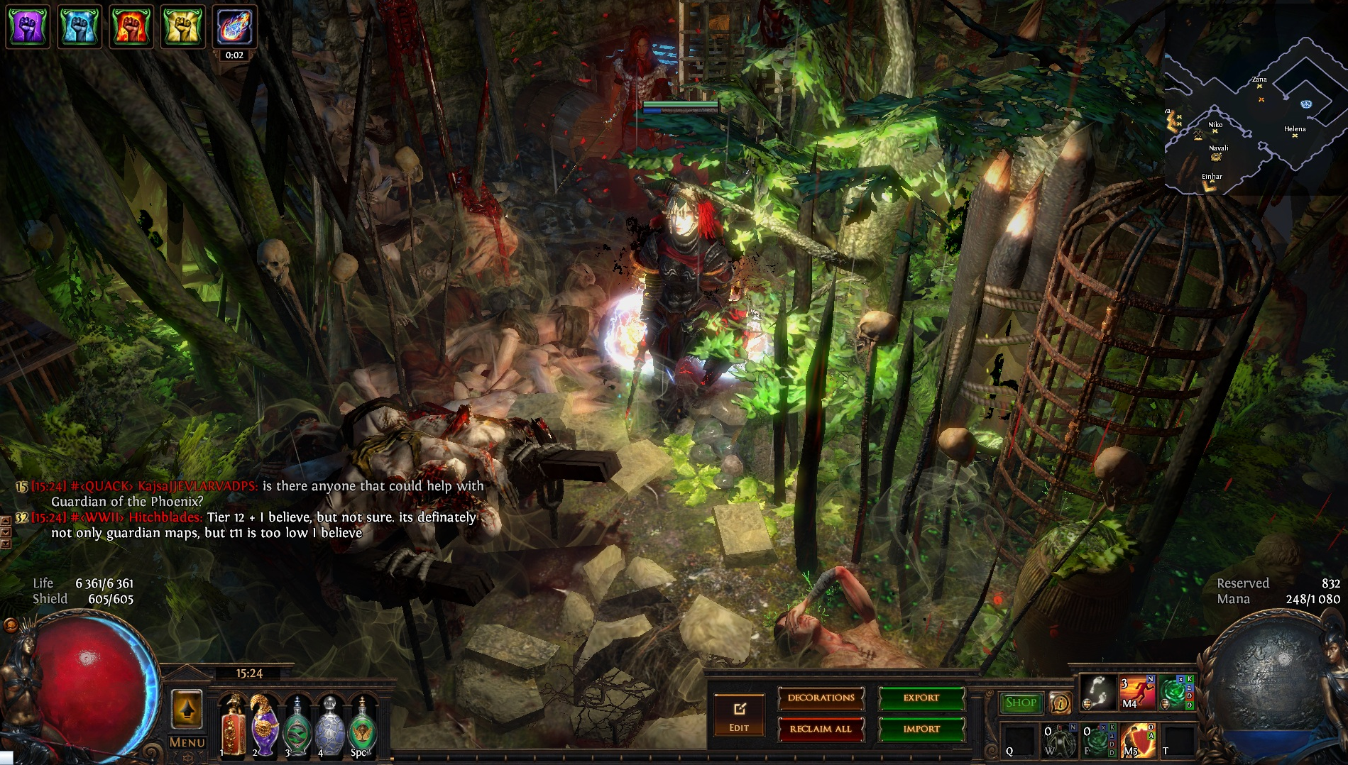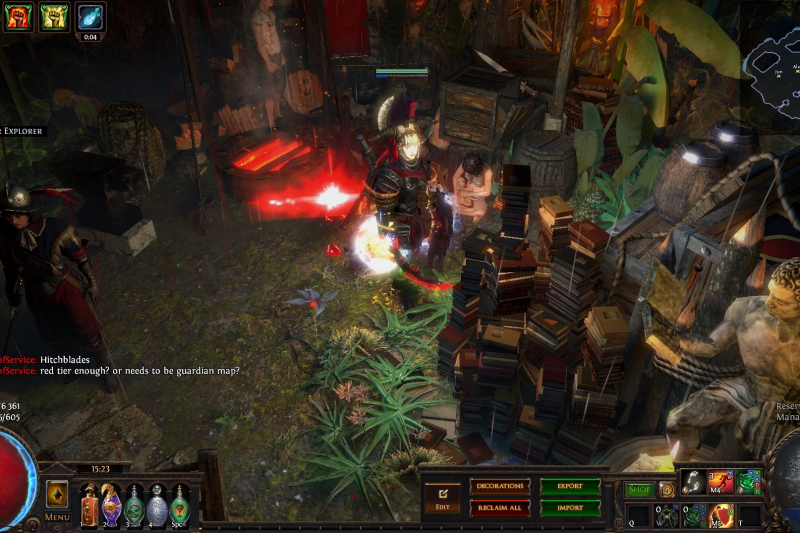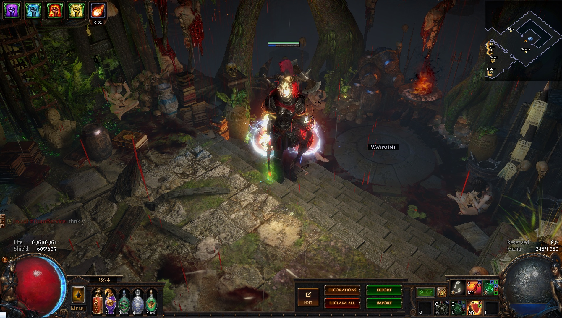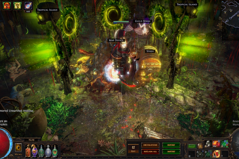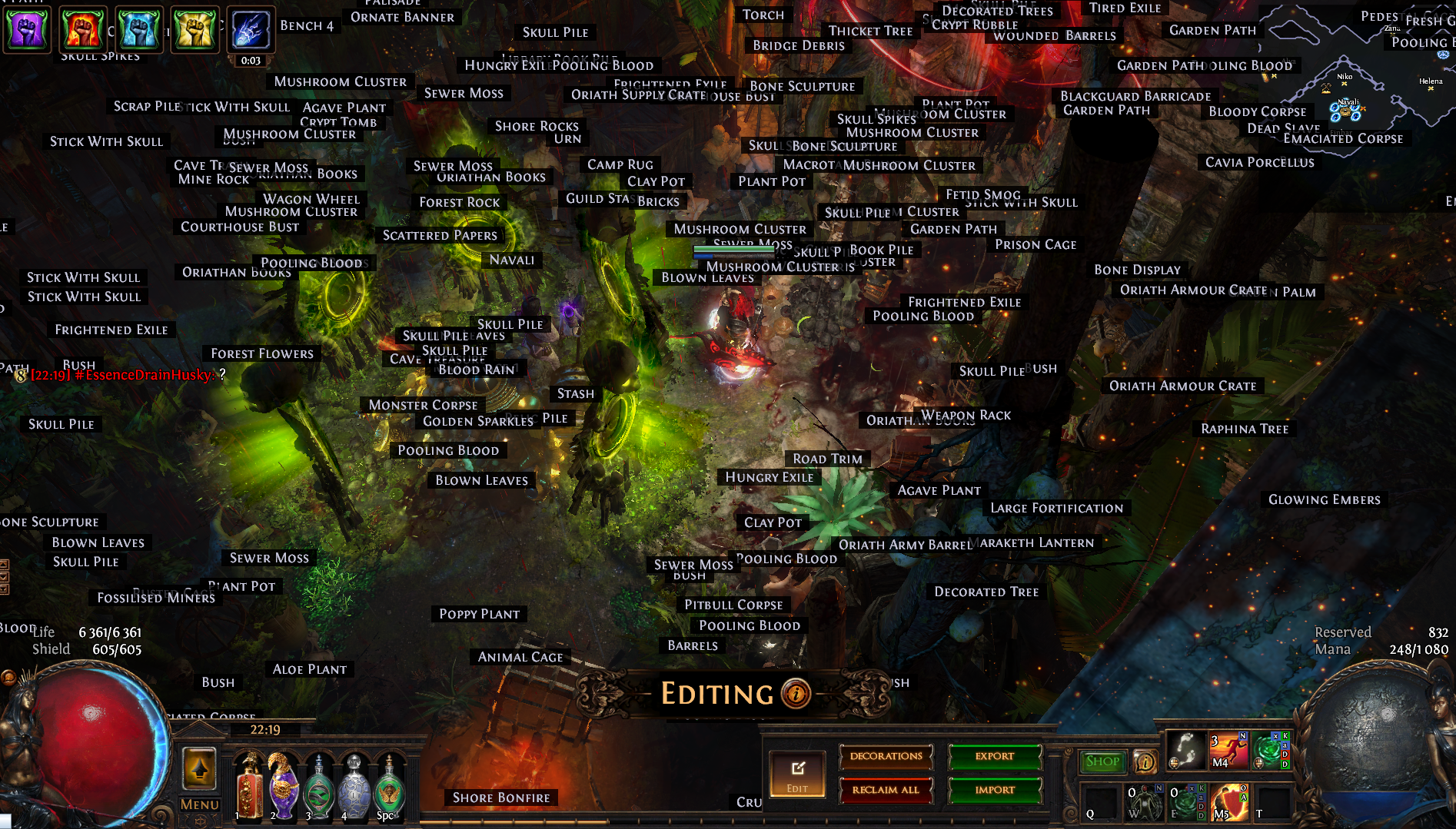 Welcome to the Desecrated Backwoods, residing deep within the dark forest. Many exiles have lost both their sanity and life here. The narrow paths around the small clearing are filled to the brim with bodies of failed adventurers and their petty loot. Their sanity seems to be draining quicker than anywhere else. The exiles that were driven to insanity have nowhere to hide, nowhere to run, and seem to fade into the woodland to become a part of nature again. How will it be exile? Are you sane enough, or will you become permanent decor of the Desecrated Backwoods? Welcome to my submission for the Path of Exile hideout competition. I made this hideout for my own usage and i wanted it to be usable whitout slowing my farming down so I've tried to place everything in reasonable places so i dont lose time mapping and such. Usability was key for me, while sticking to the theme. The only thing you need to pay for to get the look for the hideout is the blood rain and the hideout works whitout it aswell even though i prefer the dark moody atmosphere it gives. I hope some of you like it atleast. If anyone wants to check it out ingame you are welcome to whisper or add me on the character Ohlolololol
