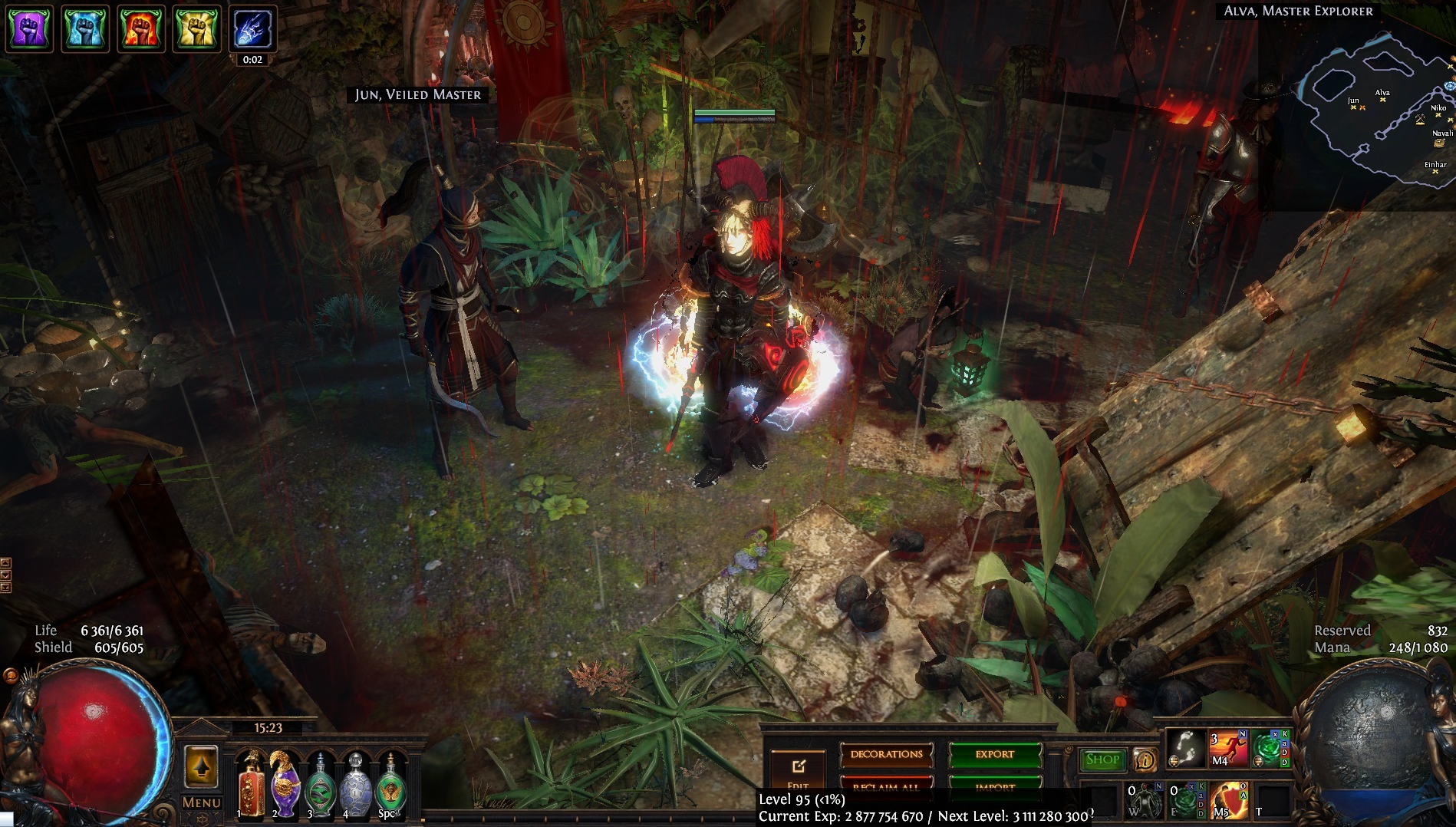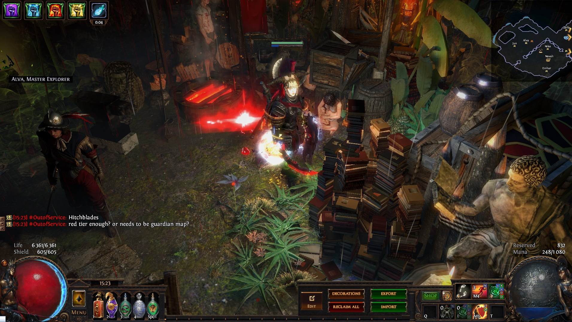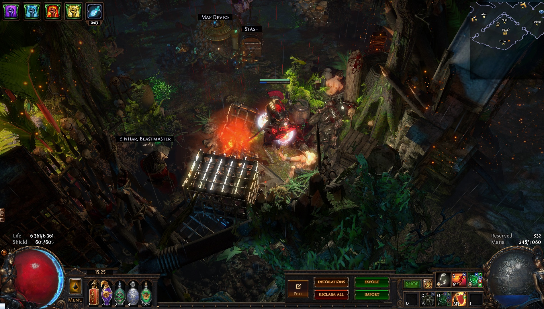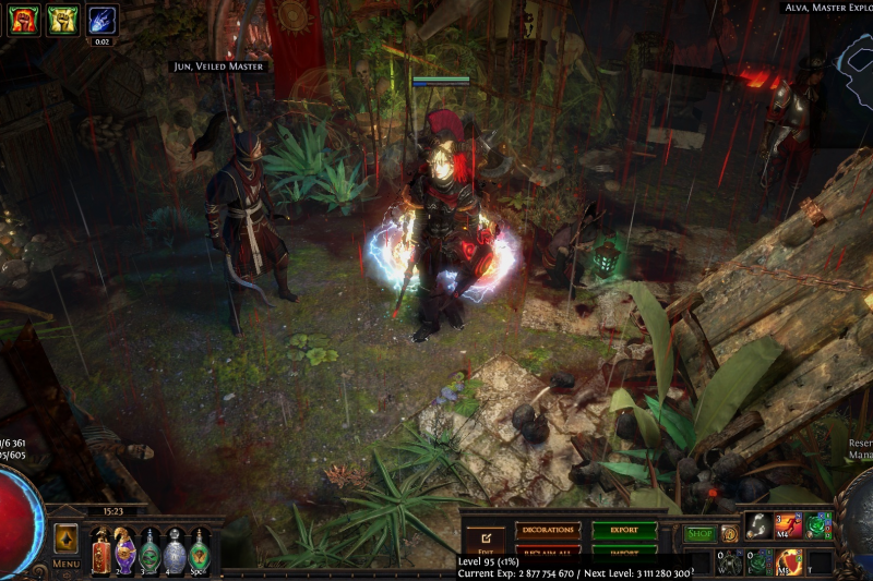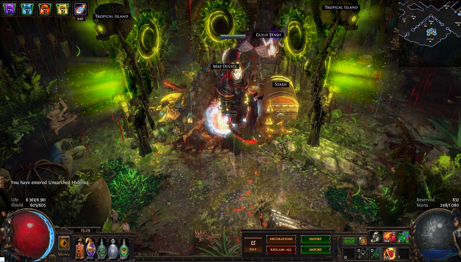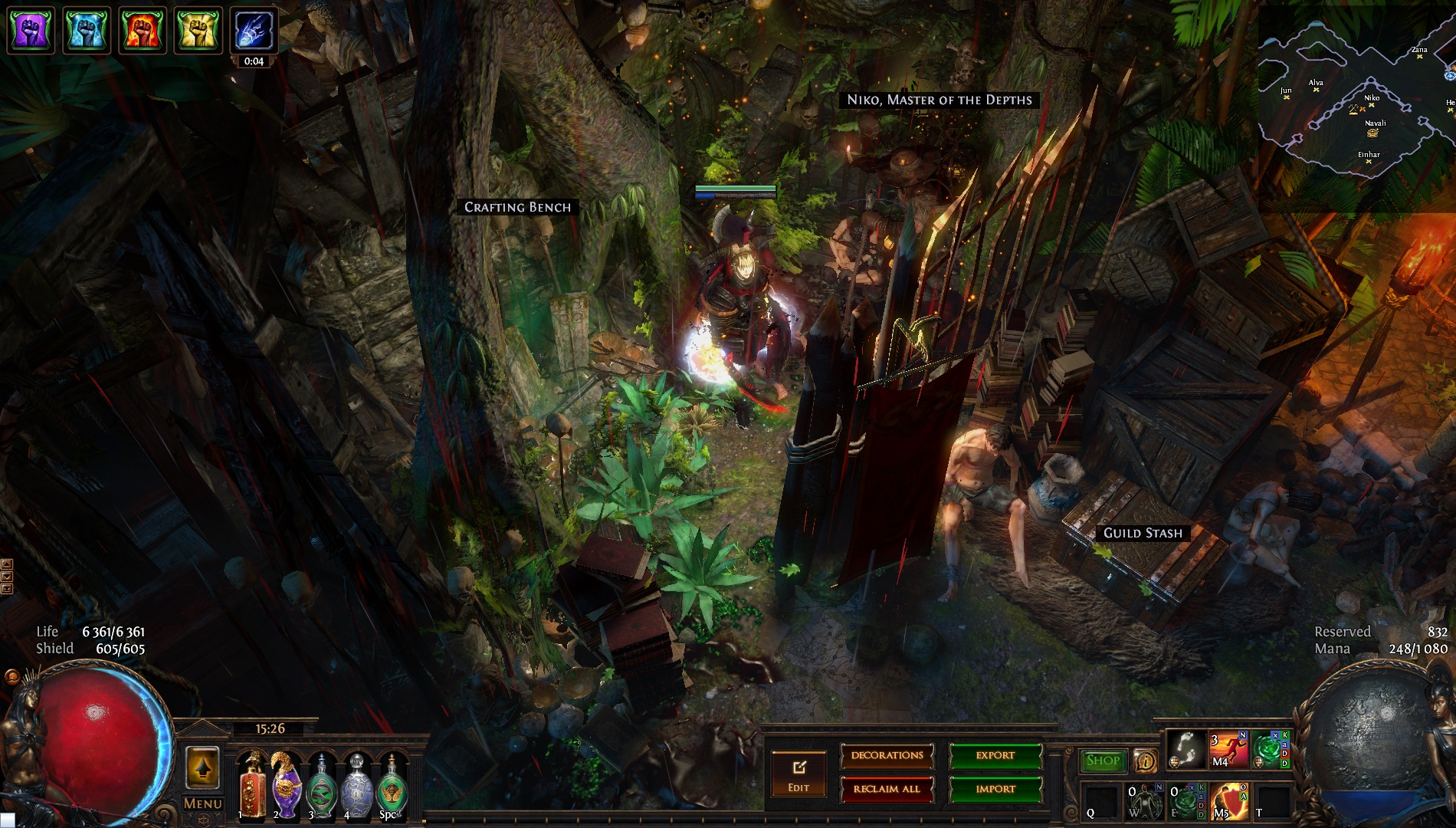 Welcome to the Desecrated Backwoods, residing deep within the dark forest. Many exiles have lost both their sanity and life here. The narrow paths around the small clearing are filled to the brim with bodies of failed adventurers and their petty loot. Their sanity seems to be draining quicker than anywhere else. The exiles that were driven to insanity have nowhere to hide, nowhere to run, and seem to fade into the woodland to become a part of nature again. How will it be exile? Are you sane enough, or will you become permanent decor of the Desecrated Backwoods? Welcome to my submission for the Path of Exile hideout competition. I made this hideout for my own usage and i wanted it to be usable whitout slowing my farming down so I've tried to place everything in reasonable places so i dont lose time mapping and such. Usability was key for me, while sticking to the theme. The only thing you need to pay for to get the look for the hideout is the blood rain and the hideout works whitout it aswell even though i prefer the dark moody atmosphere it gives. I hope some of you like it atleast. If anyone wants to check it out ingame you are welcome to whisper or add me on the character Ohlolololol