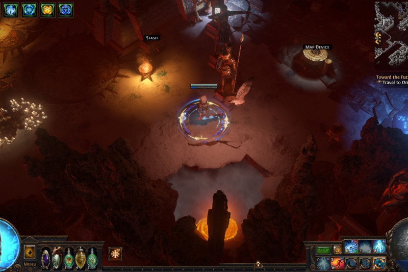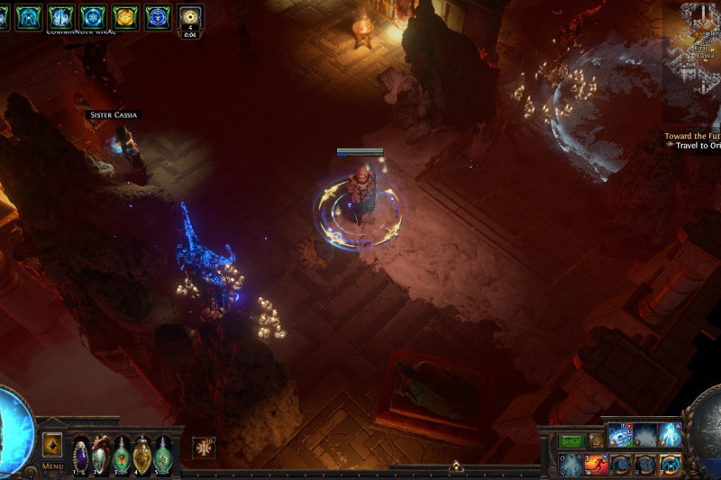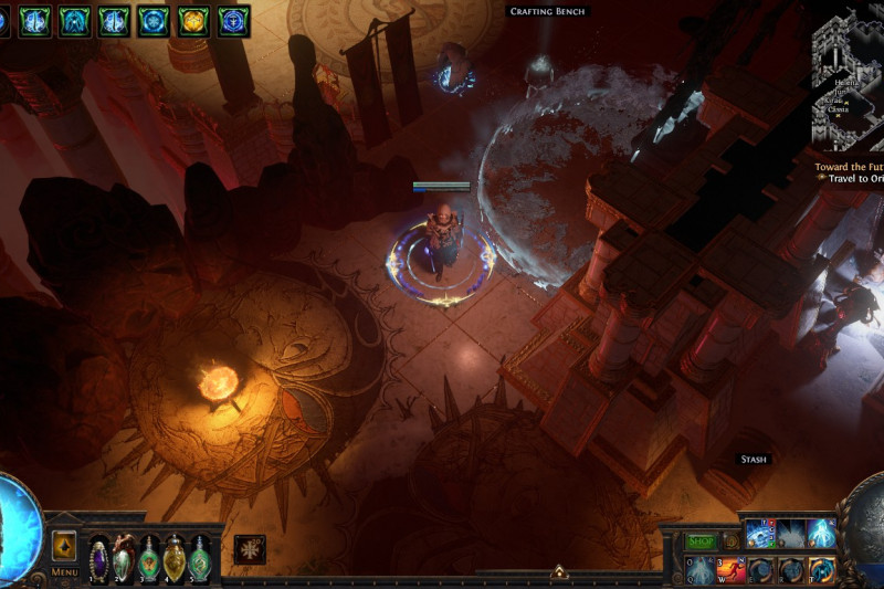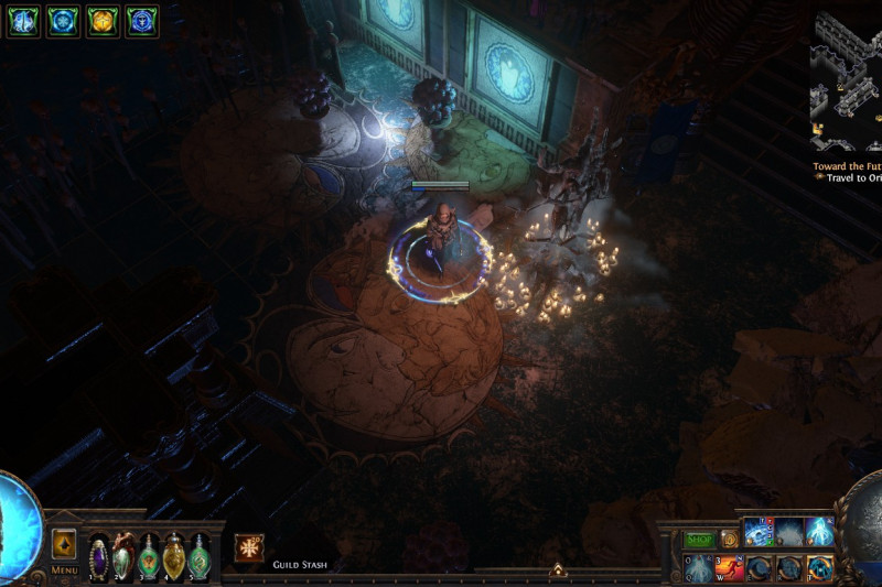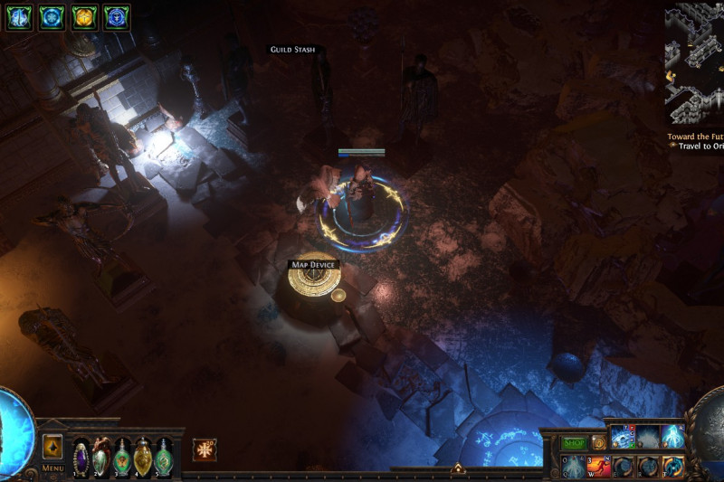 A glacial temple marked by the conflict between the Sisters, which has made space for Kitava's influence to begin spreading. On the Solaris side there are Karui spiritual decorations and an idol of an Ox while the Lunaris side is marked by more eerie, bony decorations, with a skeletal beast shrine. On the backend of the center of the temple is (apart from the trophy), a site which showcases different phases of a devoted sun and moon priestess through female deities: the statue and murals of the Sisters, Lady Justice, the Maiden.