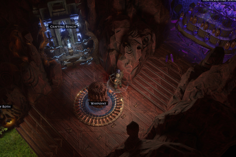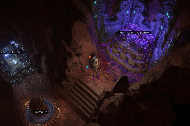 Fairly basic concept with no MTX. All the walls are covered with Kaom Rocks. The horticrafting station is purple with Lotus Stands, the regular crafting bench is blue with energy particles from various Kalguur decorations, the map device is hidden in maple trees. All NPCs are accessible, but hidden in rocks. There is a lantern corresponding to each NPC to signal their position. (Niko and a few other NPCs poke out a bit because of their weapons).