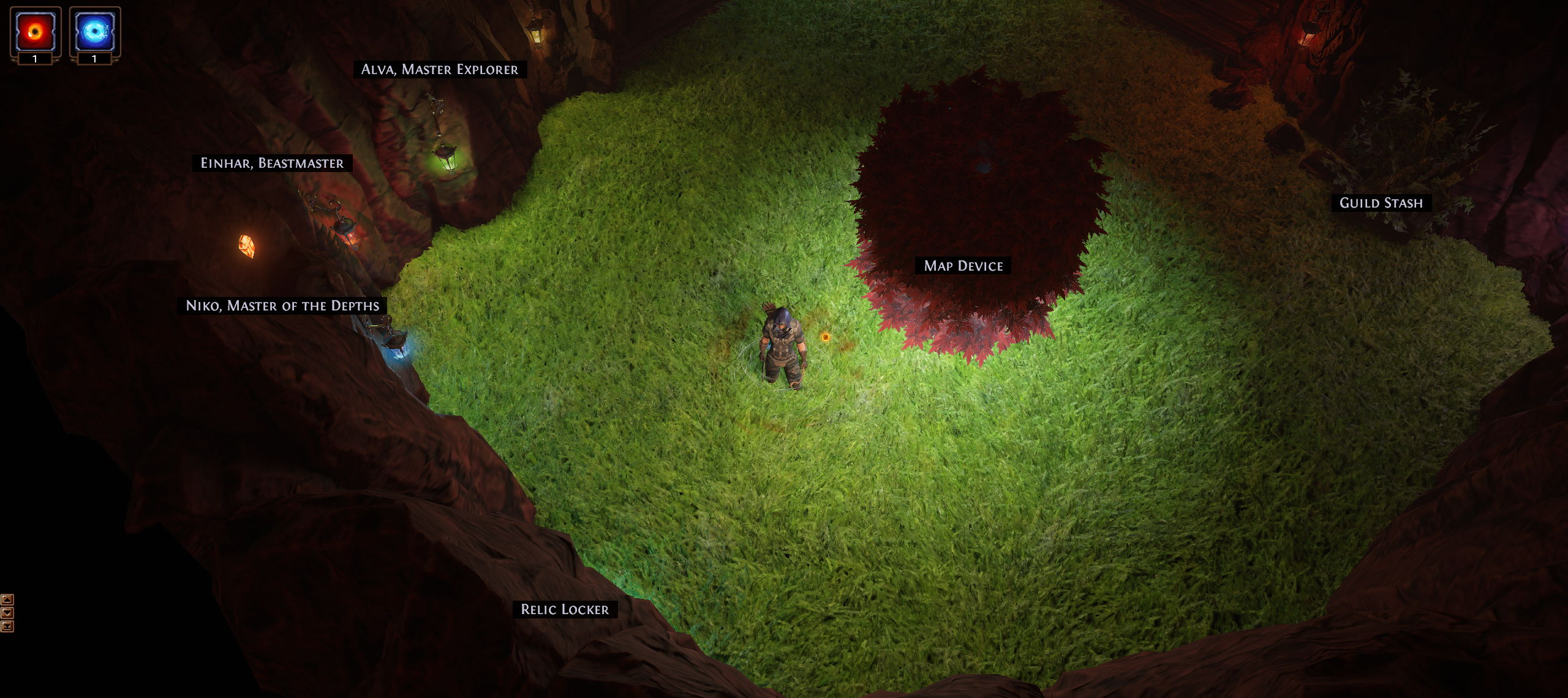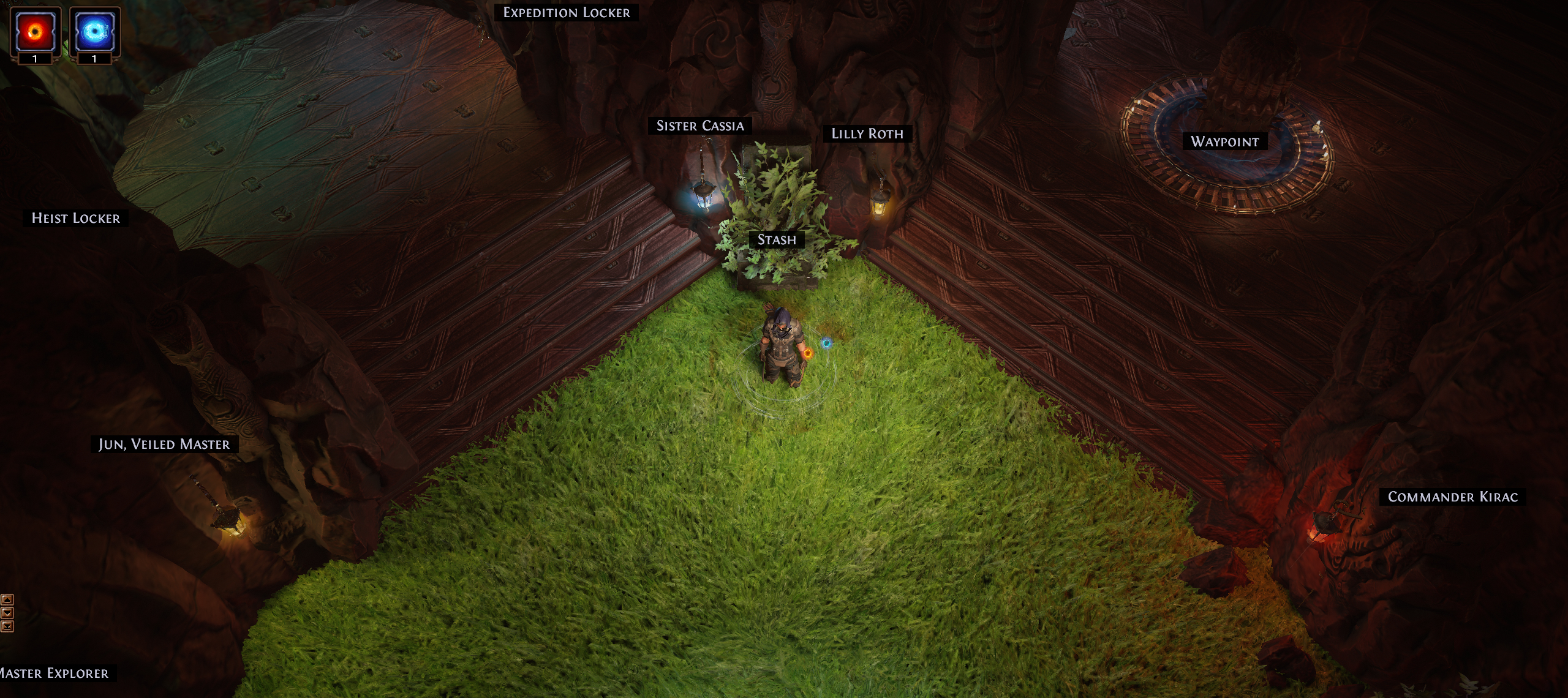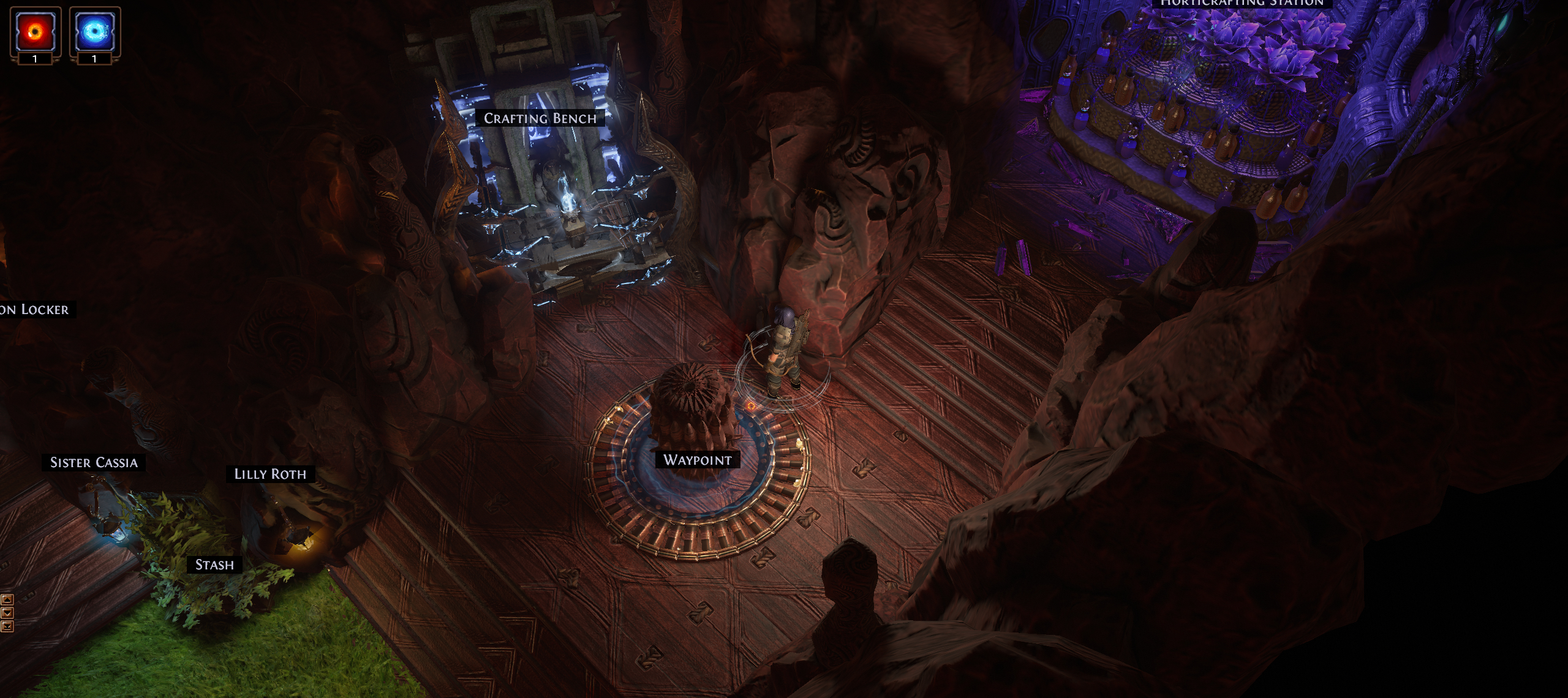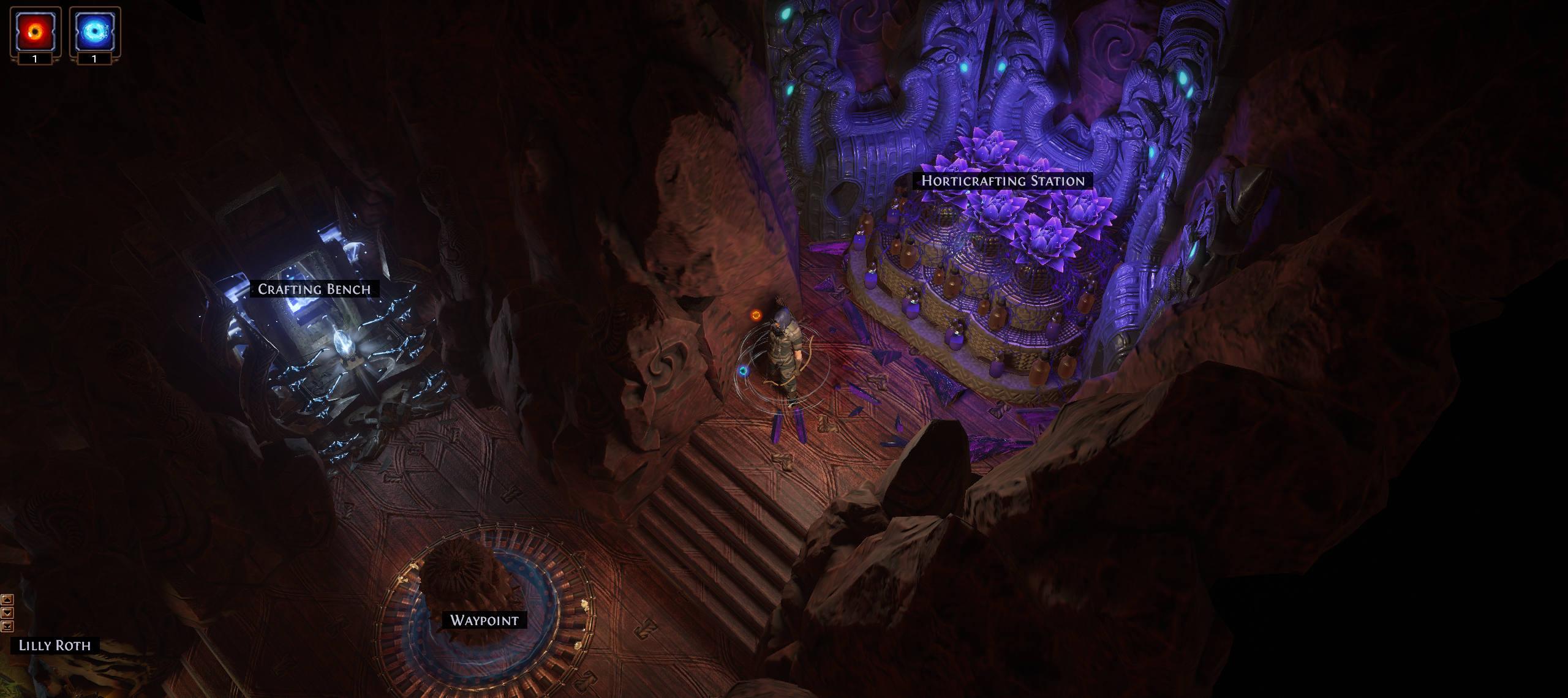 Fairly basic concept with no MTX. All the walls are covered with Kaom Rocks. The horticrafting station is purple with Lotus Stands, the regular crafting bench is blue with energy particles from various Kalguur decorations, the map device is hidden in maple trees. All NPCs are accessible, but hidden in rocks. There is a lantern corresponding to each NPC to signal their position. (Niko and a few other NPCs poke out a bit because of their weapons).
