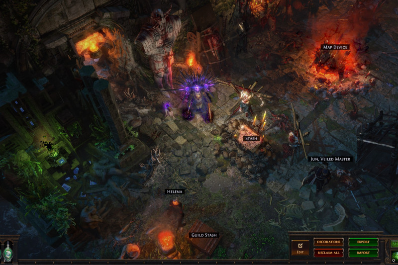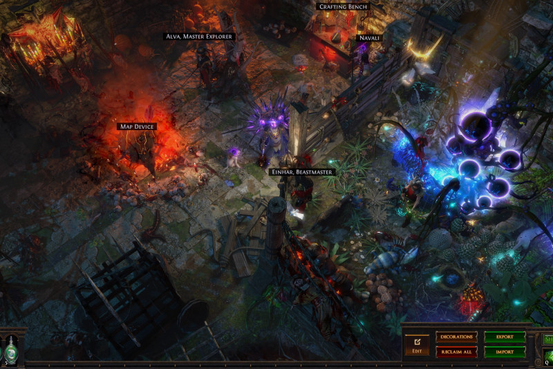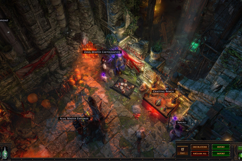There are also microtransaction decorations here and there. Not to mention a ton of pets that I gathered through my time of playing PoE. So that little "zoo" area filled with pets may be empty when you import it. All I can help you with that is to advise you to remove the "zoo" and decorate that corner however you want, or remove decorations blocking the passage to the third area behind the "zoo" which I decorated mostly to be seen from the main area (stash + map device) and didn't intend to go there, so the area is WIP/unfinished.