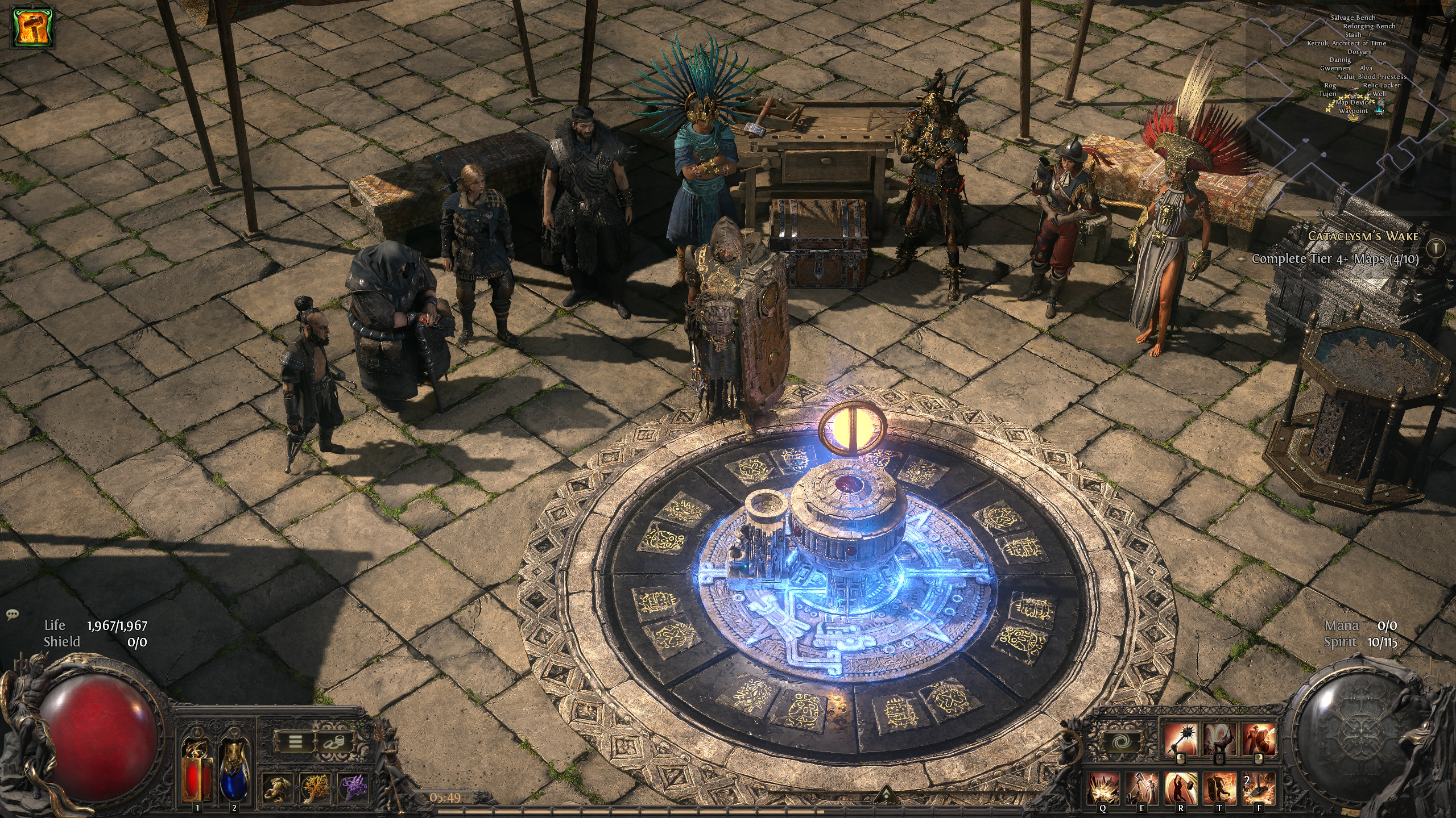 A tight circle of NPCs surround the portal device, so that you don't need to move around the place, instead everything is a click away. The NPCs and items are rotated to face towards the map device, and have the same distance from each other around the circle. Waypoint is right below the map device.