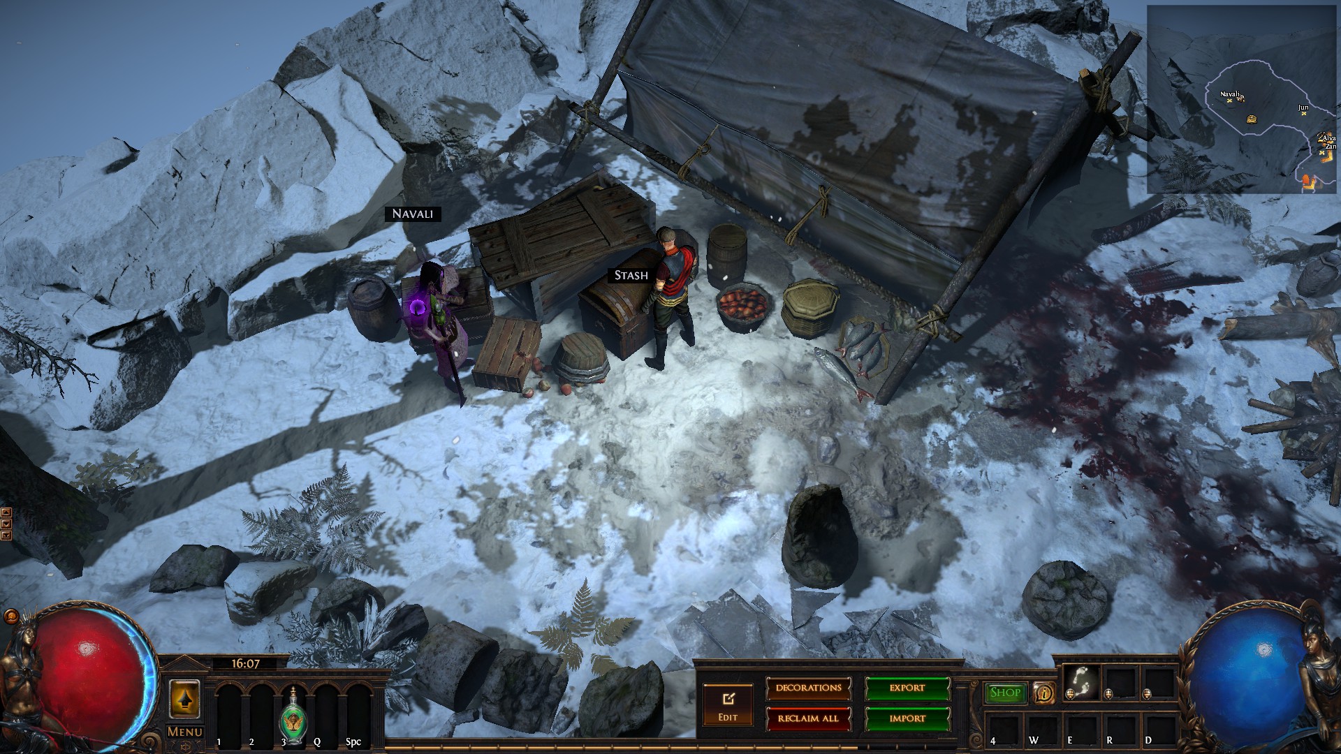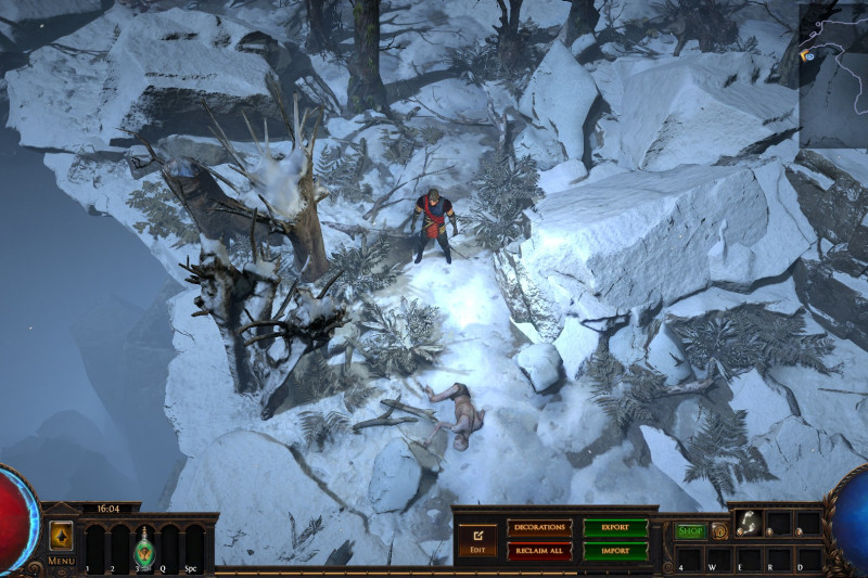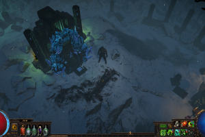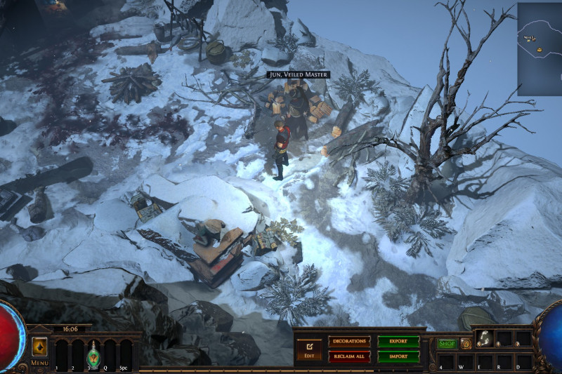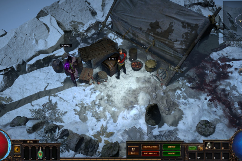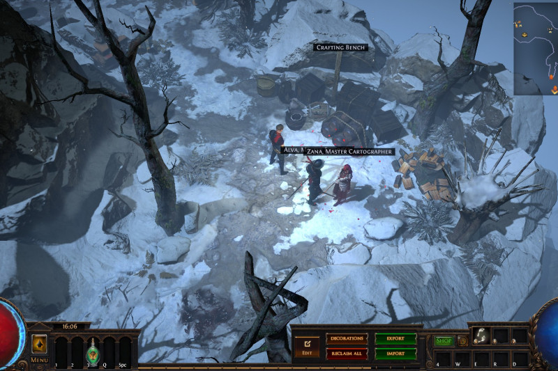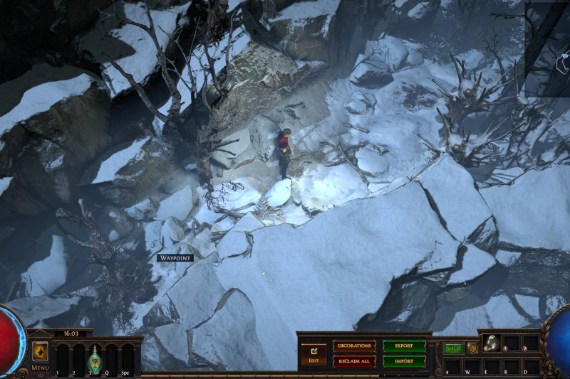 Hideout is divided in two - the forest area and the summit. Forest area does not contain anything but the Waypoint. The summit contains Crafting bench, Zana, Alva and Jun, all with good positions for theire portals. Near the tent, amidst the supplies, Navali and Stash are located. There you can place Guild Stash, if you're in one. Map divice located near the Stash and as for the portals, better to use those that are close to the ground and red-ish or any other that are bright. Falling snow and misterious white tint on these mountain create unnerving feeling of loneliness. Watch your step Exile and beware... there is something in the snow.