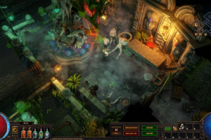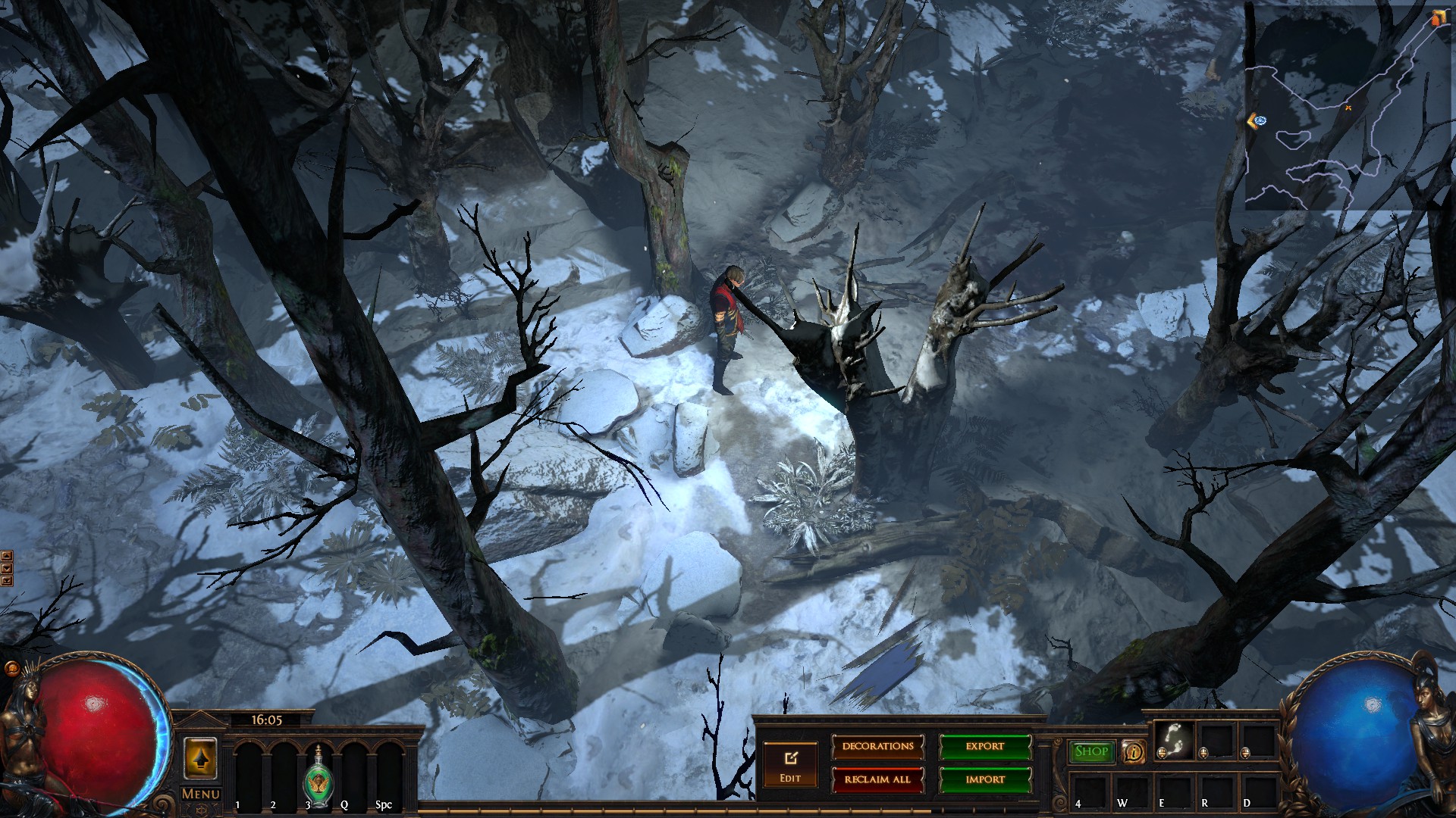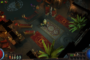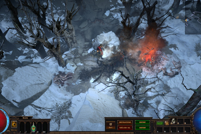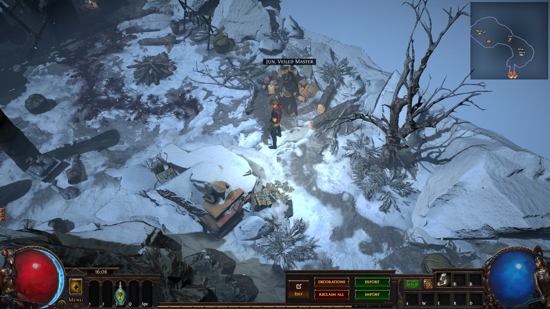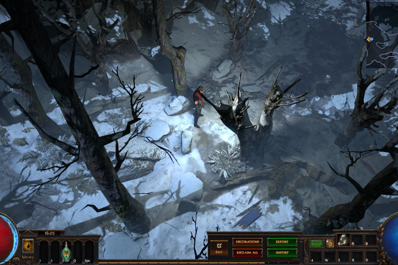 Hideout is divided in two - the forest area and the summit. Forest area does not contain anything but the Waypoint. The summit contains Crafting bench, Zana, Alva and Jun, all with good positions for theire portals. Near the tent, amidst the supplies, Navali and Stash are located. There you can place Guild Stash, if you're in one. Map divice located near the Stash and as for the portals, better to use those that are close to the ground and red-ish or any other that are bright. Falling snow and misterious white tint on these mountain create unnerving feeling of loneliness. Watch your step Exile and beware... there is something in the snow.