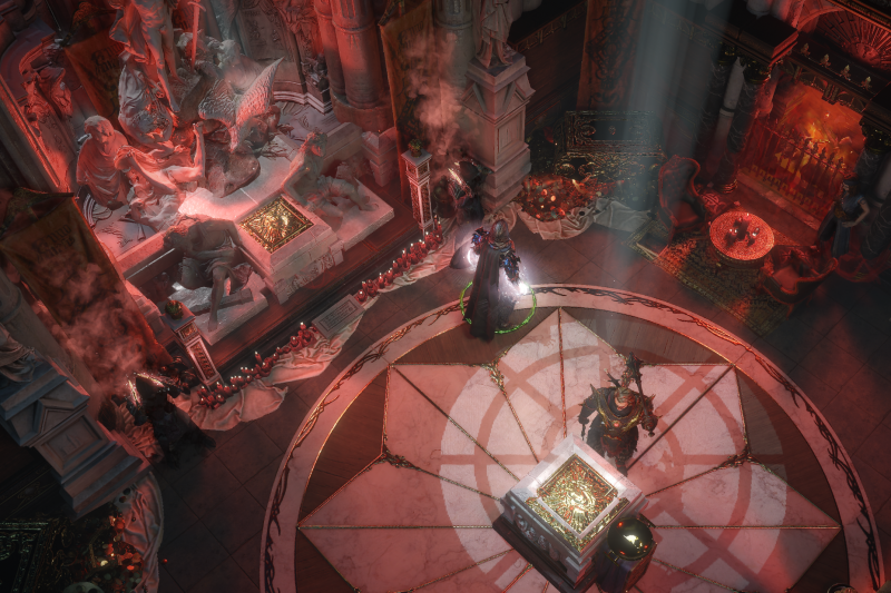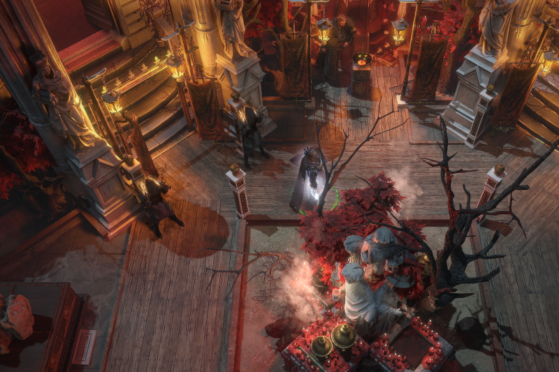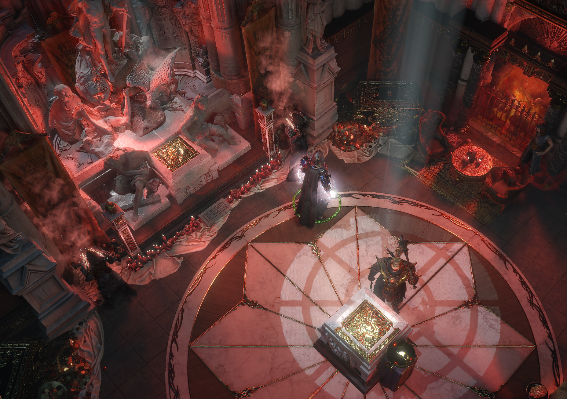 I wanted to create a bigger hideout, which includes more indoor/outdoor flow. This hideout includes an inner chamber for mapping ,storage, vendors, and a pavillion type design with philosophers stones and sand gardens.