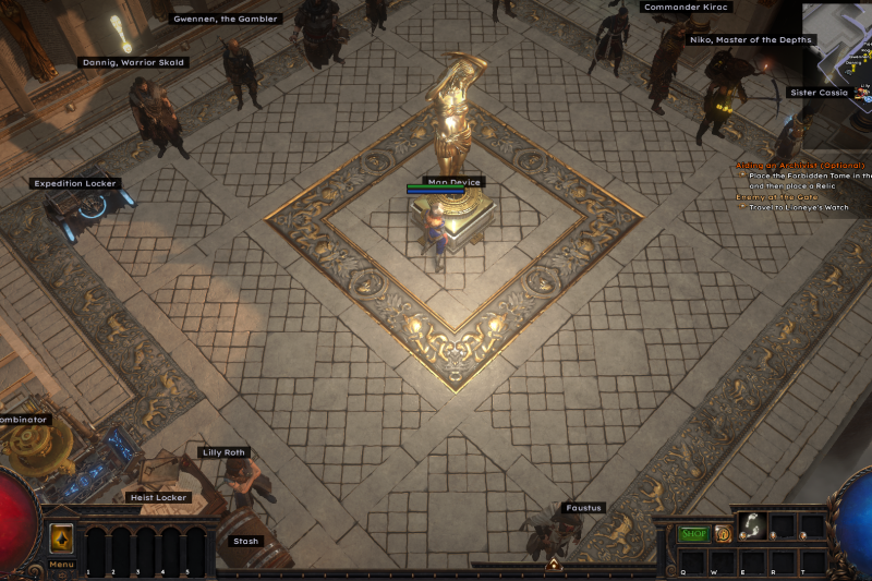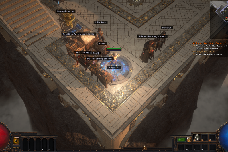 Plateau of the Gods Hideout South is a MTX-free hideout for the Nocturnal Hideout featuring minimal decorations in a small space with stashes, Crafting Bench, Heist Locker, and the Horticrafting Station all near the waypoint with the Map Device not far away.